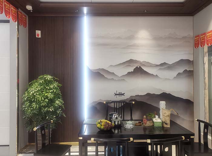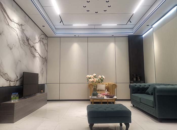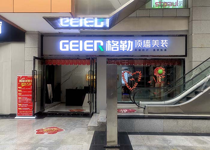 一進入店里,干凈整潔的環(huán)境讓人感覺非常舒適。作為頂墻一體店,店內(nèi)的吊頂、墻面等裝修用的也是格勒的產(chǎn)品,可以說是“一步一景”,無需進入樣板間,只在曲折回轉(zhuǎn)間便能見到格勒頂墻之美。