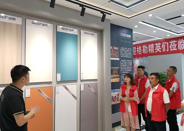 上午,在市場部富經(jīng)理的帶領(lǐng)下,各地經(jīng)銷商家人們參觀了格勒鎮(zhèn)雄專賣店。鎮(zhèn)雄店是一家頂墻一體店,也是格勒最新的SI形象店。